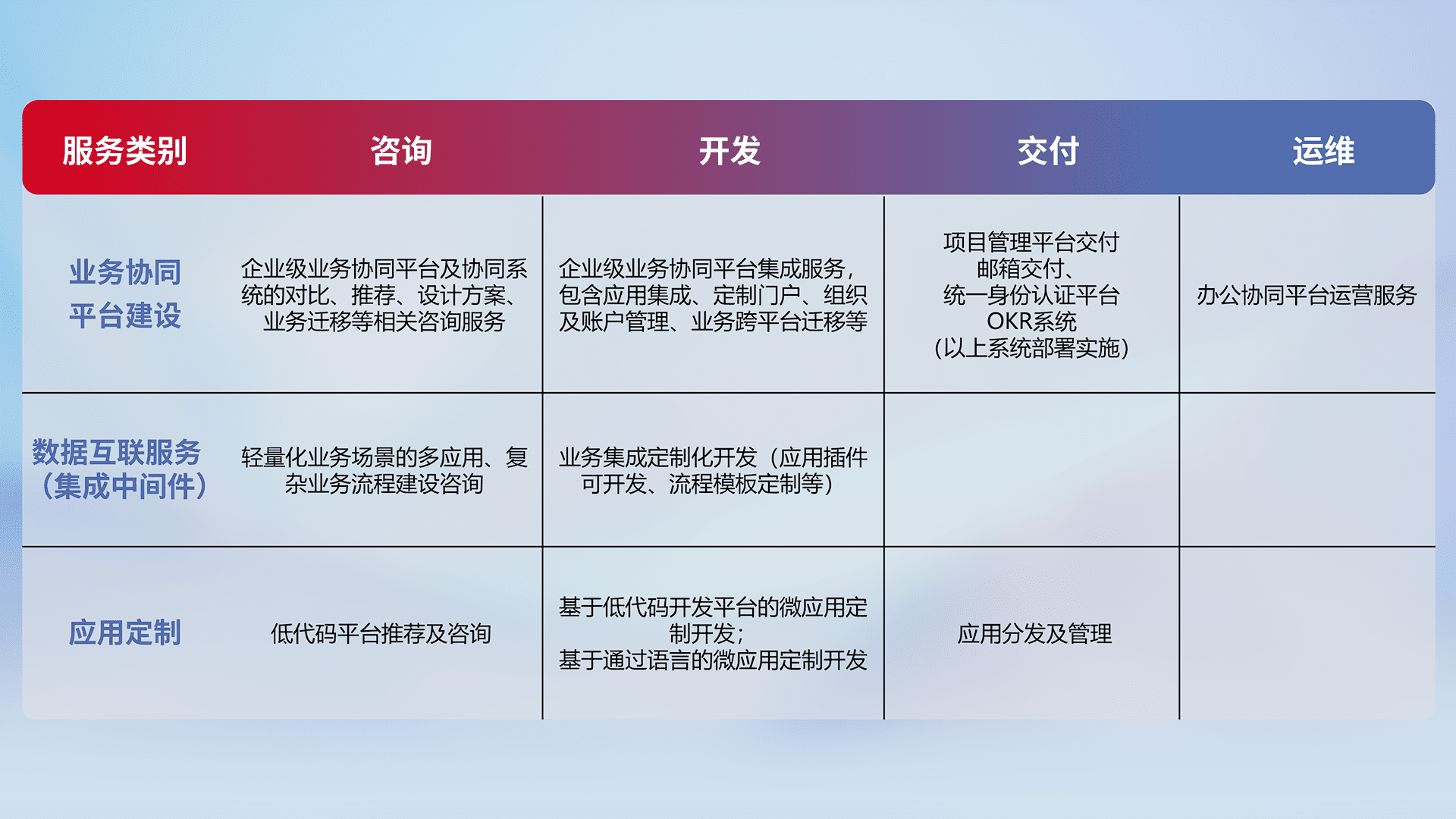 针对钉钉、、、企微、、IDaas等平台级产品提供产品的规划、、方案、、交付、、定制化开发等服务,,,,实现如统一协同办公、、、、智能客户服务、、、混合会议管理、、、智能数据查询、、等业务场景,,实现数字化转型。。。。